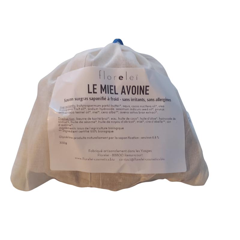 Composé de beurre de karité qui apporte beaucoup de douceur au savon et d'une synergie d'huiles (coco, olive,sésame, abricot) choisies pour leurs propriétés émollientes, régénératrices et hydratantes, le Miel Avoine est un savon gourmand de couleur oranger clair, moucheté par le son d'avoine qui lui confère des propriétés exfoliantes douces. L'association des produits de la ruche, miel et cire d'abeille, lui apporte un très léger parfum sucré. Le miel est connu pour raffermir la peau; c'est aussi un émollient et humectant. La cire d'abeille, en plus d'être elle aussi émolliente, a des propriétés calmantes. Elle favorise l'hydratation de la peau en facilitant la rétention de l'eau par l'épiderme.